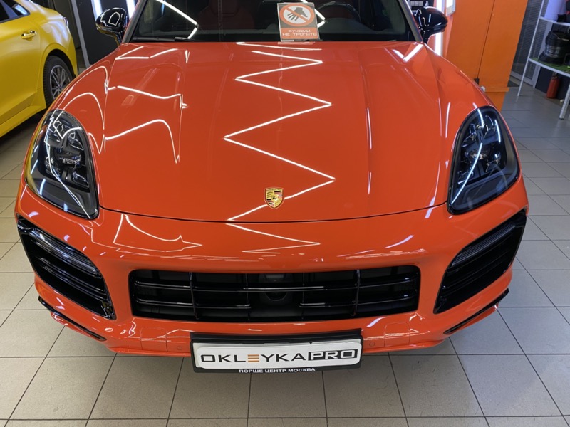 Подготовили кузов Porsche Macan (удалили вмятины, сделали полировку) и оклеили его (без крыши, спойлера и ручек) в красный глянцевый винил KPMF, нанесли керамику на пленку. Покрасили шильдики и защитили оптику.