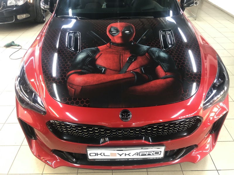Аэрография «Дедпул» — идеальный вариант для красных автомобилей.