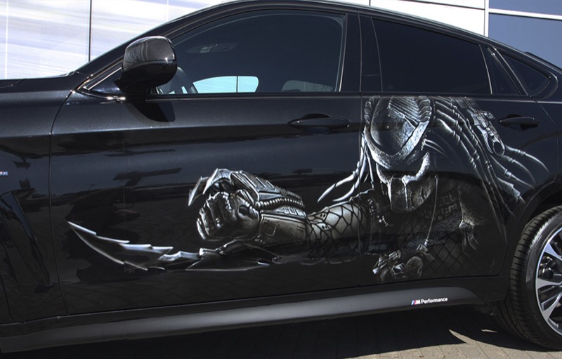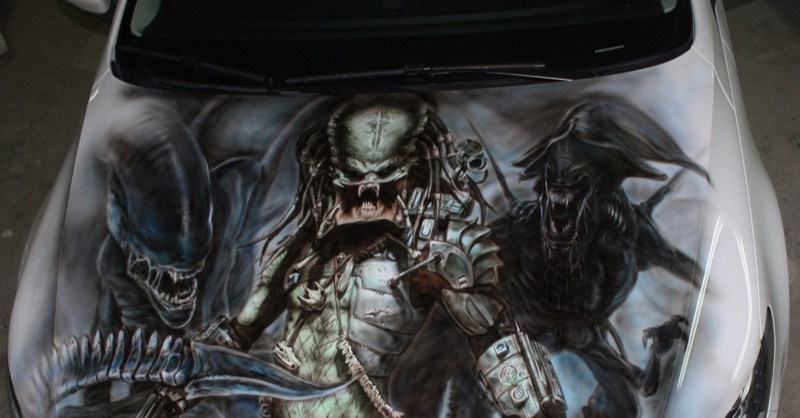 Поклонникам научной фантастики хорошо знакомы культовые фильмы о представителе злобной инопланетной расы, прибывшей на Землю с единственной целью убивать. Поэтому для винилографии автомобиля можете выбрать как изображение героя Арнольда Шварценеггера из первого фильма, так и схватку Чужого с Хищником из ленты, вышедшей на экраны в 2018.