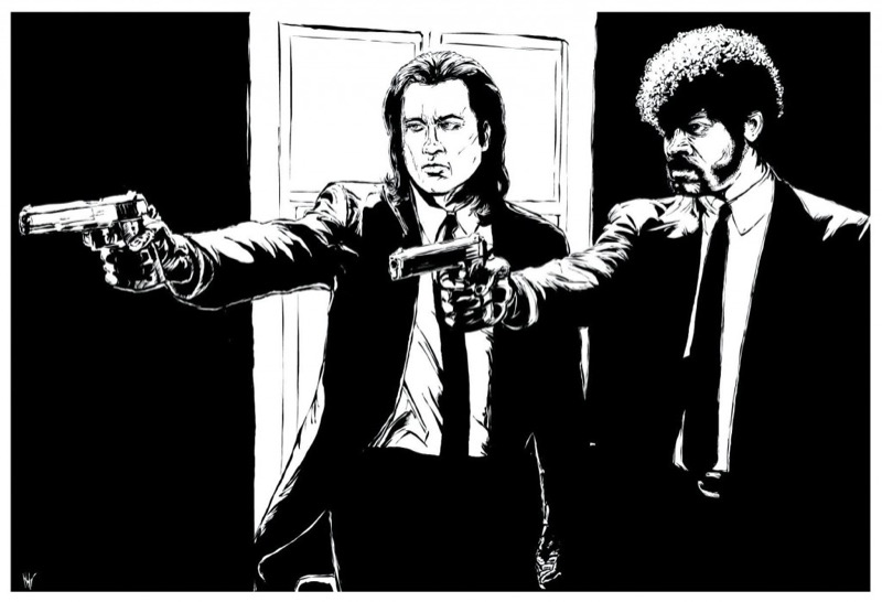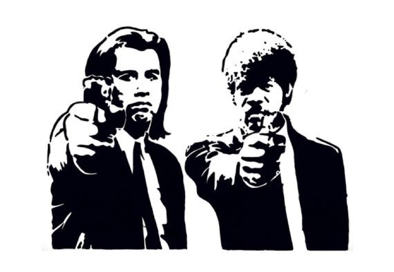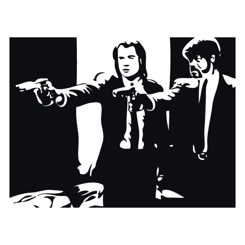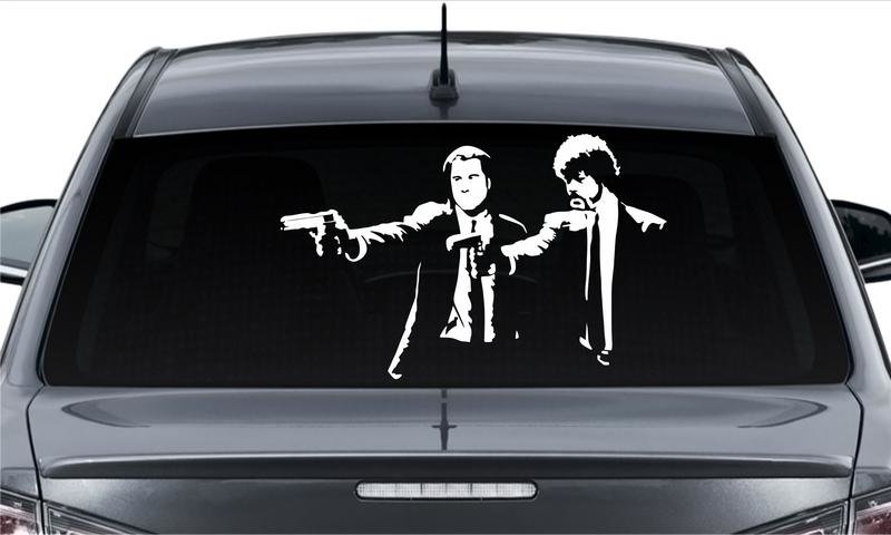 Черно-белая винилография с изображением главных героев культового фильма «Криминальное чтиво» обычно украшает заднее стекло, запаску, двери, борт или багажник автомобиля. Изображение печатают на заказ на плотной виниловой пленке, обрезают плоттером и наносят на подготовленное лакокрасочное покрытие кузова.