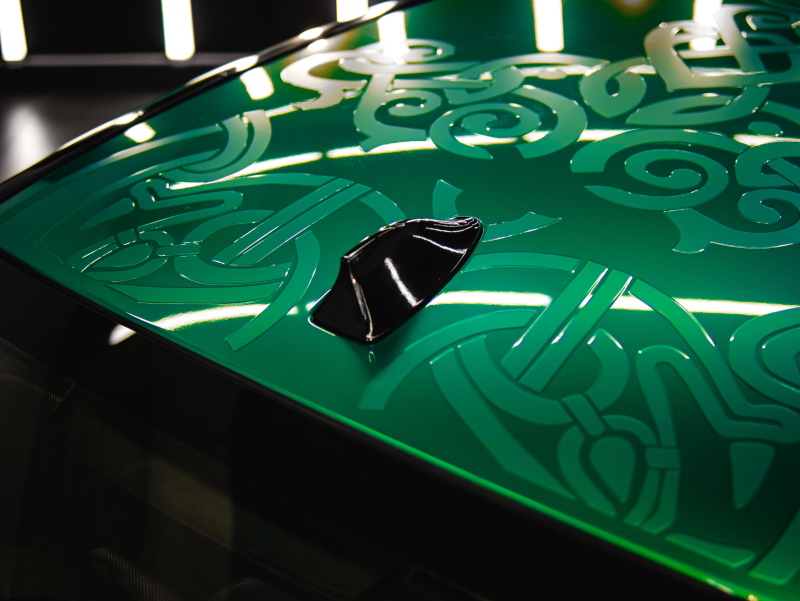 Сняли старую пленку, отполировали кузов, нанесли винилографию в два слоя и оклеили кузов в изумрудный винил от Teckwrap. Защитили передние фары и задние фонари в полиуретан, сделали антихром.