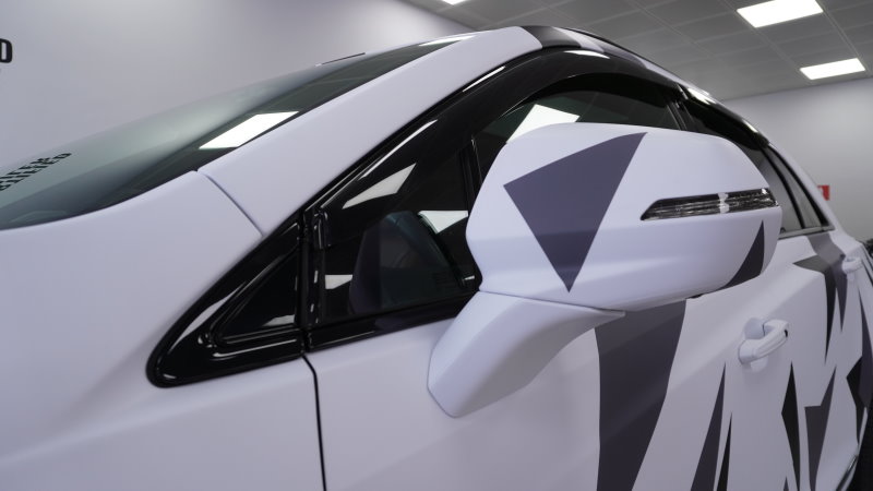Демонтировали старую пленку. Оклеили кузов в виниловую пленку Иристек (белый матовый хром), нанесли керамику. Оклеили зеркала в черный глянец, крышу в черный гибрид.
