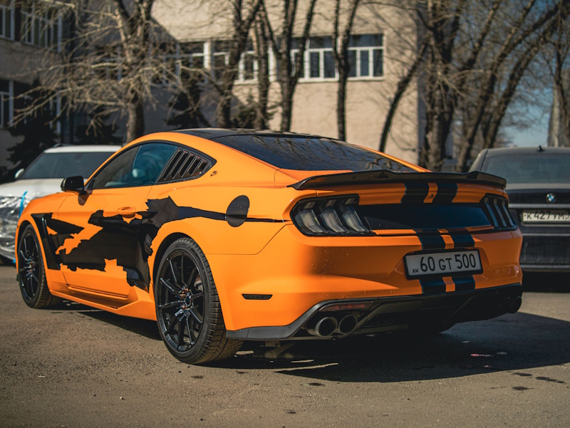 Разработали индивидуальный дизайн оклейки автомобиля Форд Мустанг. Выполнили оклейку кузова оранжевой виниловой пленкой Oracal 970 и поверх пленки нанесли черные виниловые наклейки.