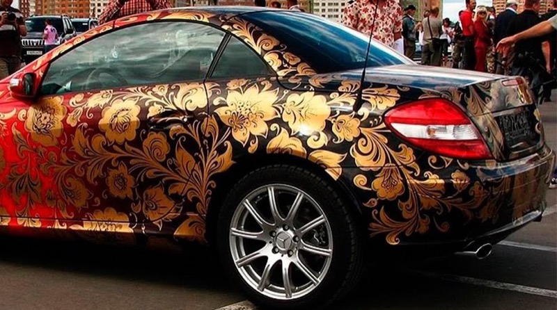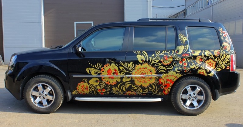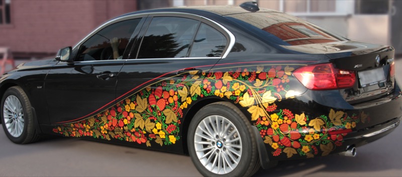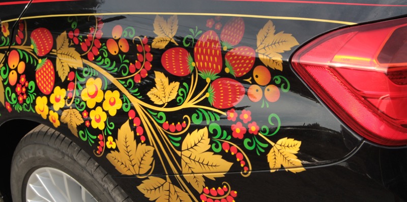 Для изготовления винилографии выберите основные цвета декора: это может быть классическая огненная хохлома или черно-белая композиция, в которой о происхождении росписи напоминают только растительные мотивы. Мы напечатаем изображение на плотной виниловой пленке и оклеим машину. Рекомендуемые места для размещения декора — капот, двери или багажник.