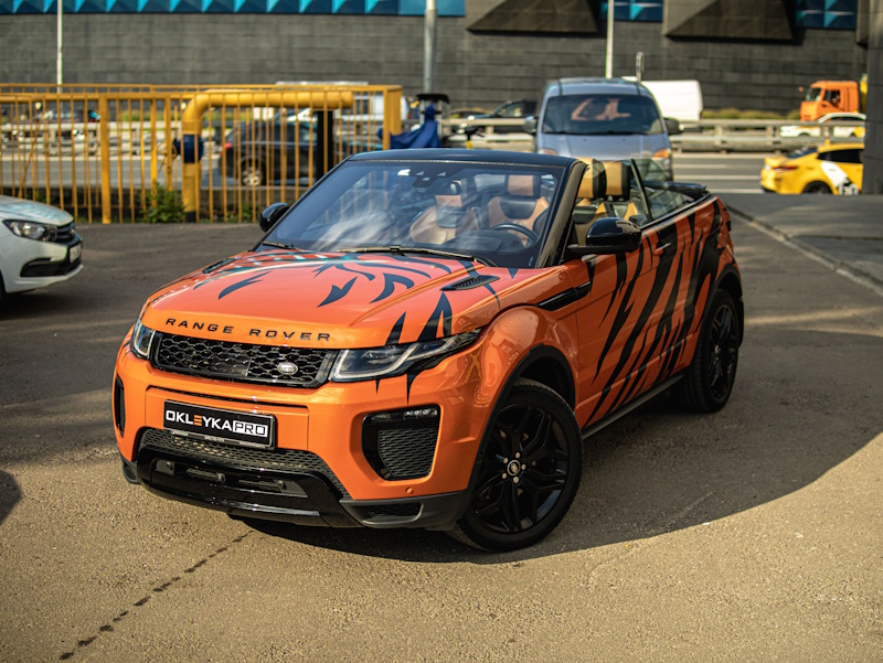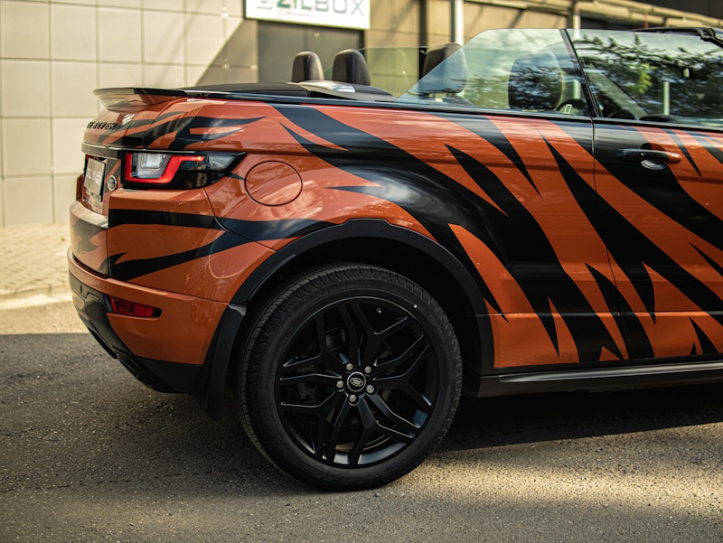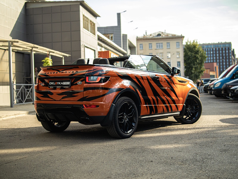 Разработаем дизайн узора, напоминающий тигриный окрас. Напечатаем на пленке, вырежем на плоттере и оклеим автомобиль.