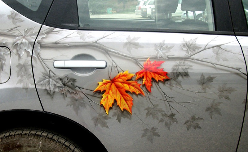 Рисунок для изготовления винилографии может быть любым: дерево от основания до макушки, склонившиеся ветви или один-единственный увеличенный в масштабе лист. Мы выполним печать изображения на виниловой пленке и профессионально оклеим автомобиль. Особенно выразительно смотрятся длинные наклейки от крыла до дверей.