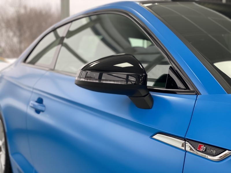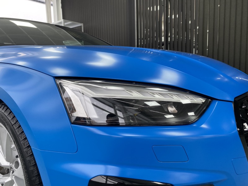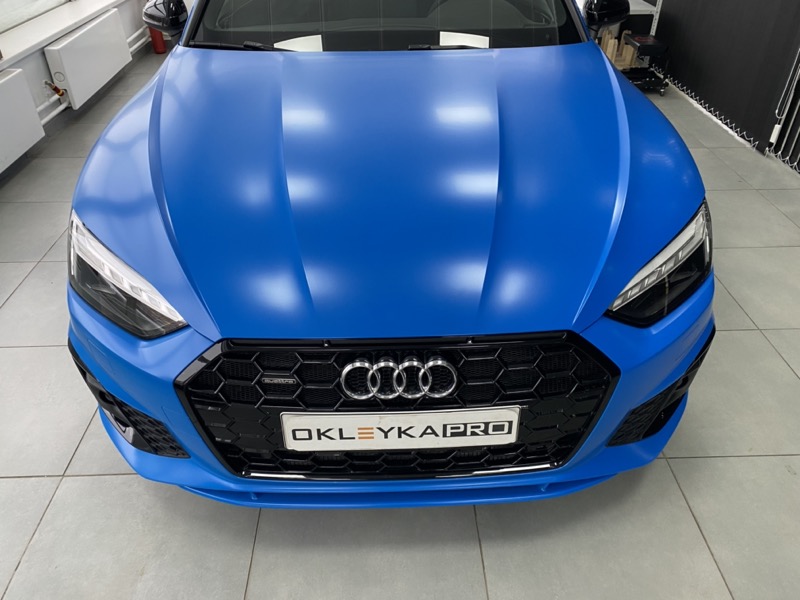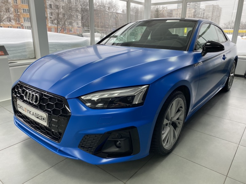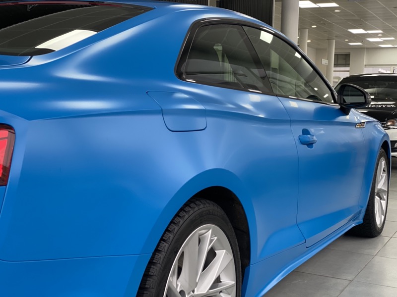 Марка автомобиля: Audi A5.Задача: защитить кузов автомобиля антигравийной пленкой. Придать автомобилю индивидуальности, для этого пленку выбрали матовую. Пленку покрыли кварцем, для дополнительной красоты и защиты.