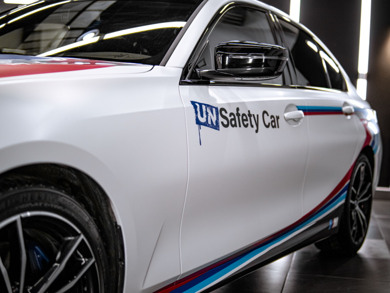 Разработали дизайн-макет, напечатали на прозрачной пленке и оклеили автомобиль BMW 3 Series, установили спойлер. Затем кузов полностью защитили в матовый полиуретан, крышу оклеили в черный полиуретан.