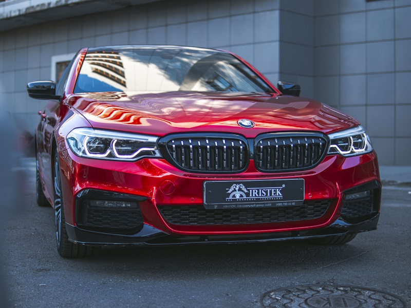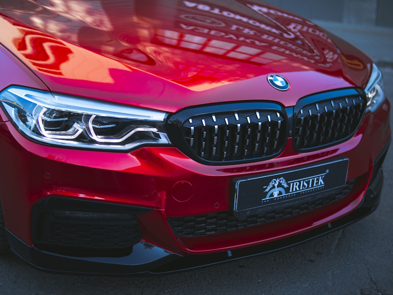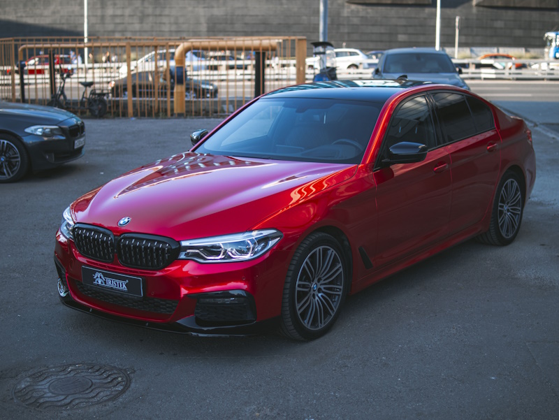 Оклеили кузов BMW M5 в красную полиуретановую пленку IRISTEK. Защитили карбоновые элементы.