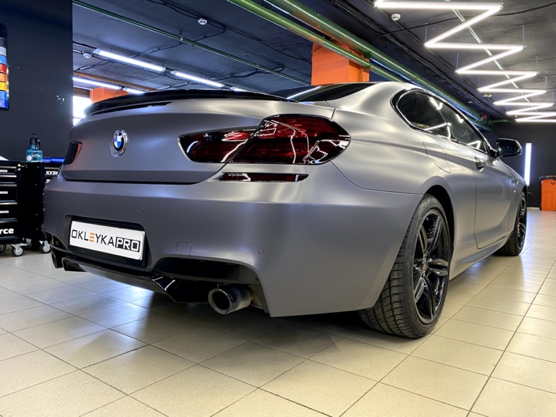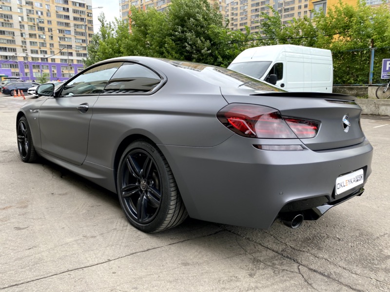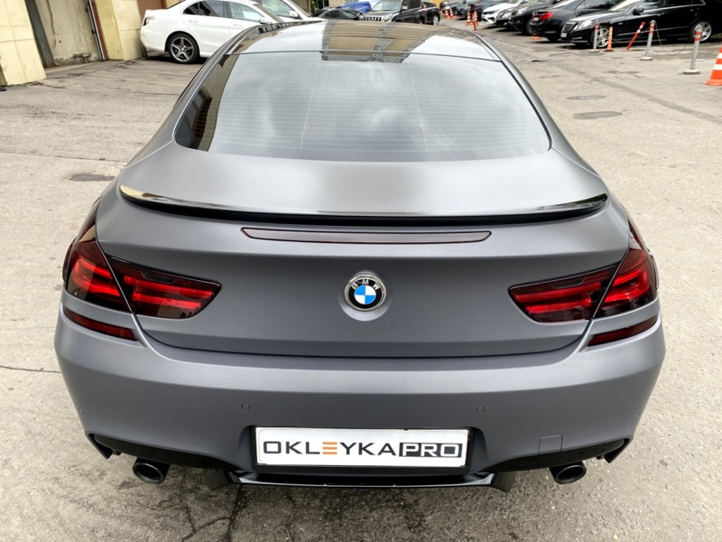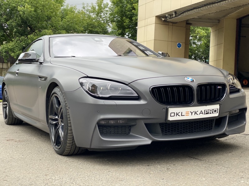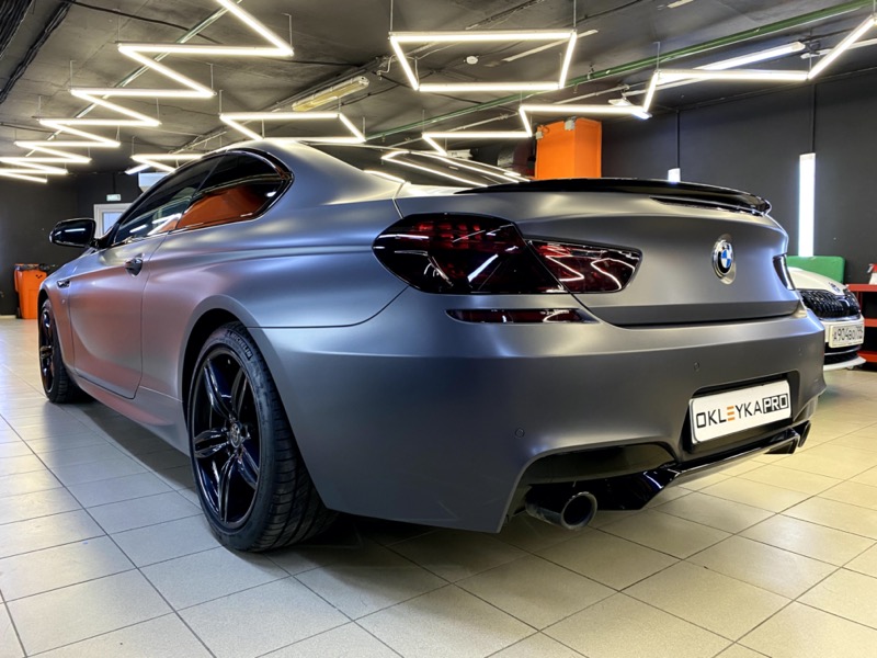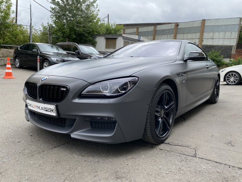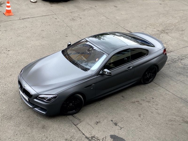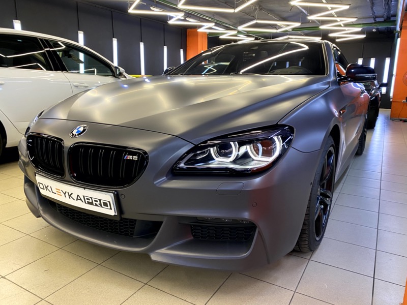 Сменить цвет автомобиля БМВ М6, с белого на серый матовый. Сделать антихром. Крышу и зеркала покрыть карбоновой пленкой. Защита фар от сколов и царапин. Керамика на пленку для усиления матового эффекта и дополнительных защитных свойств.