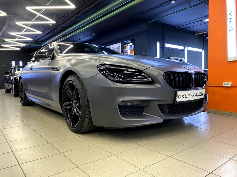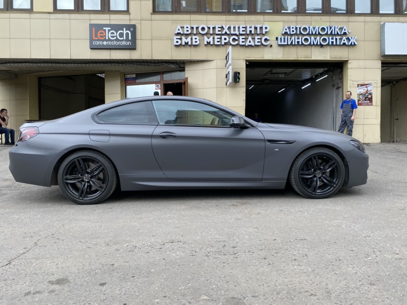 Сменили цвет автомобиля БМВ М6, с белого на серый матовый. Сделали антихром. Крышу и зеркала покрыли карбоновой пленкой. Защитили фары от сколов и царапин. Керамику на пленку для усиления матового эффекта и дополнительных защитных свойств.
