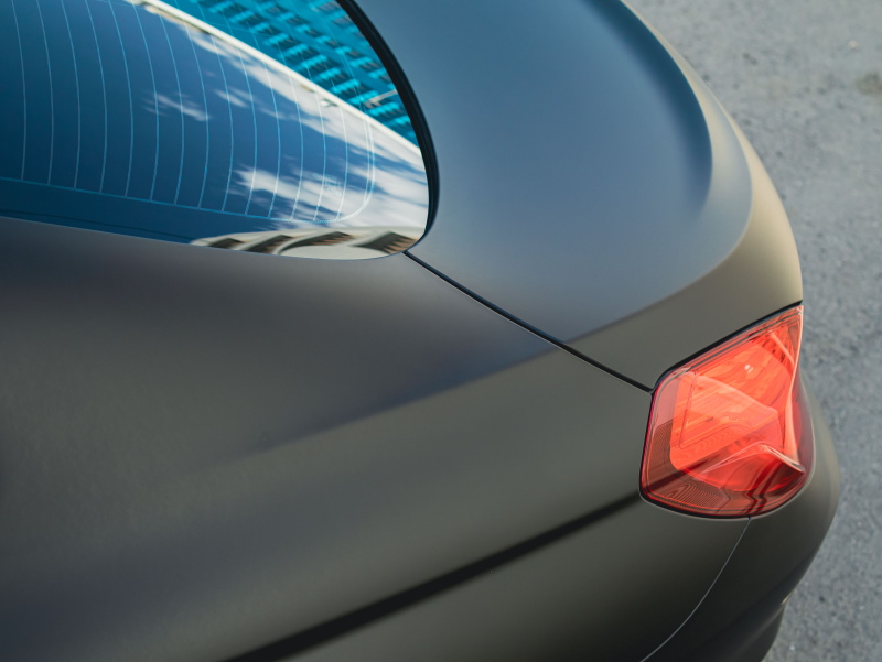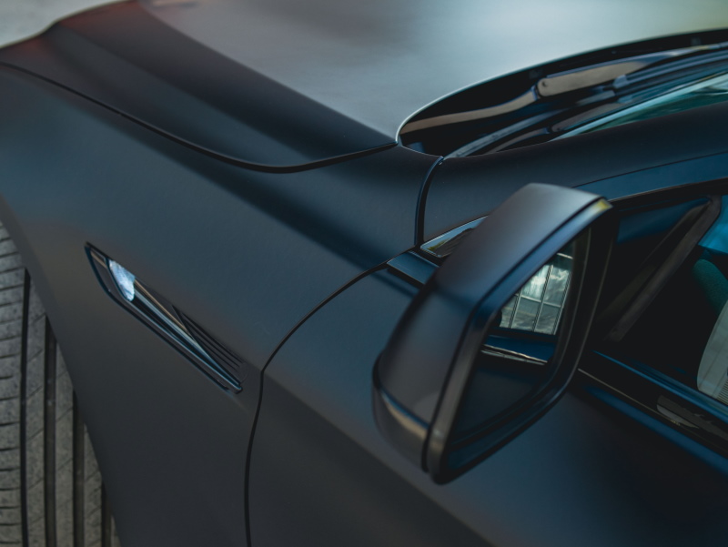 Выполнили полную оклейку кузова в цветной винил (PET Satin Chrome Black «Черный хром»), на пленку нанесли керамику. Затонировали передние фары и сделали антихром решетки и жабр.