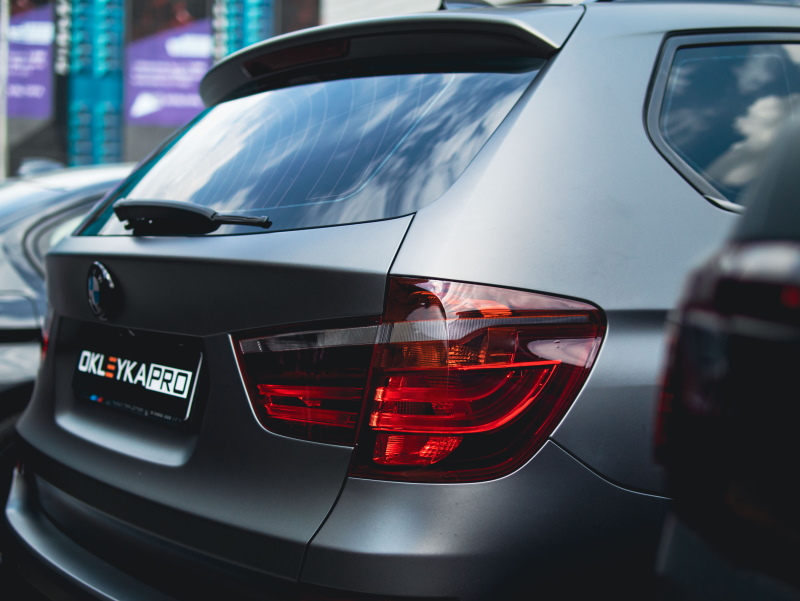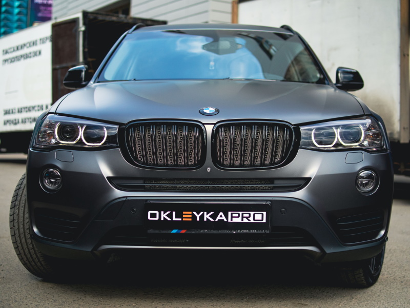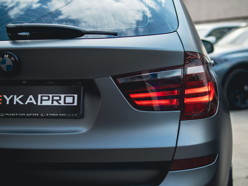 Подготовили автомобиль BMW X3 к оклейке (удалили вмятины). Выполнили полную оклейку кузова с проемами в цветной винил (цвет «Пепельный серый»). Затонировали задние стекла. Оклеили рейлинги в черный глянец. Защитили передние фары и задние фонари в полиуретан.