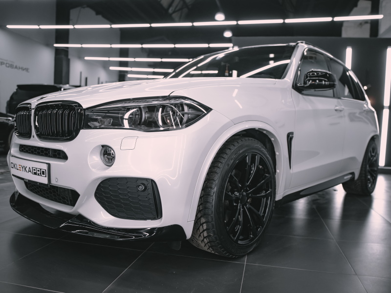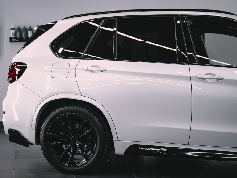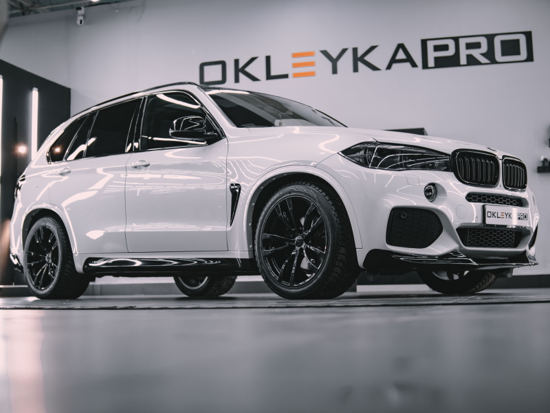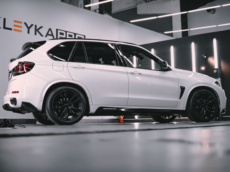 Оклеили автомобиль BMW X5 по пакету «Стандарт», оставшуюся часть кузова отполировали и покрыли керамикой. Оклеили крышу и спойлер в черный гибрид, а фонари защитили в притемненный полиуретан. Покрасили диски в черный глянец, установили обвес и нанесли полосы Performance.