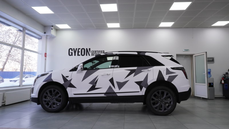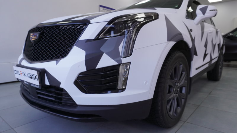 Разработали дизайн-макет, выполнили полную оклейку автомобиля Cadillac XT5 в «камуфляж», покрасили диски в графит, защитили фары в притемненный полиуретан, сделали тонировку задней полусферы.