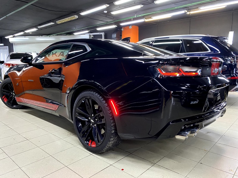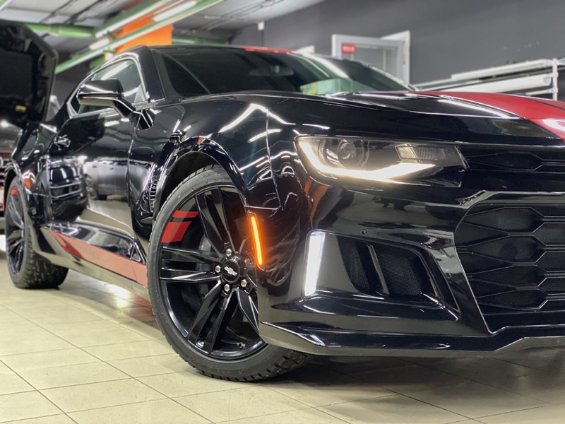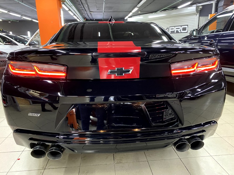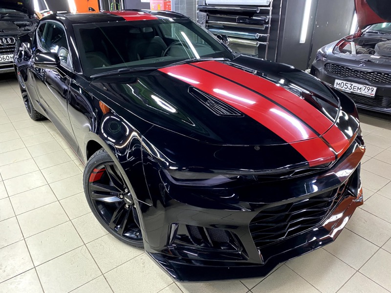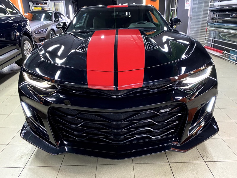 Полировка фар автомобиля Chevrolet Camaro, защита фар полиуретановой пленкой, антихром и нанесение красных спортивных полос на капот, крышу и багажник.