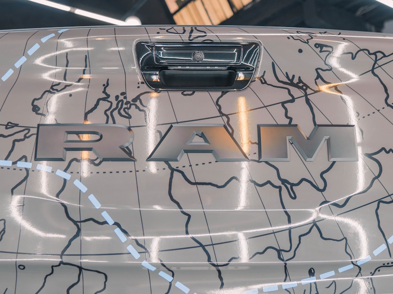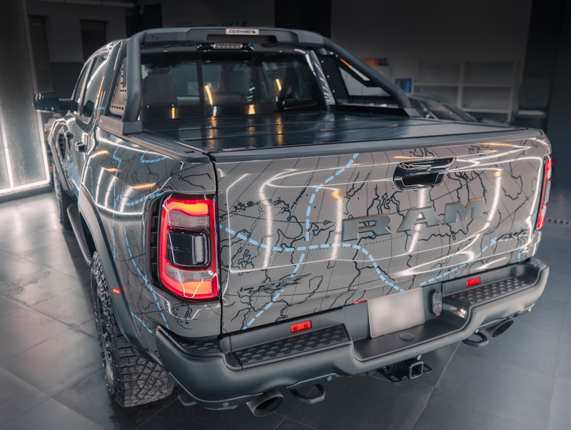 Оклейка передней части кузова автомобиля RAM TRX и нанесение винилографии.