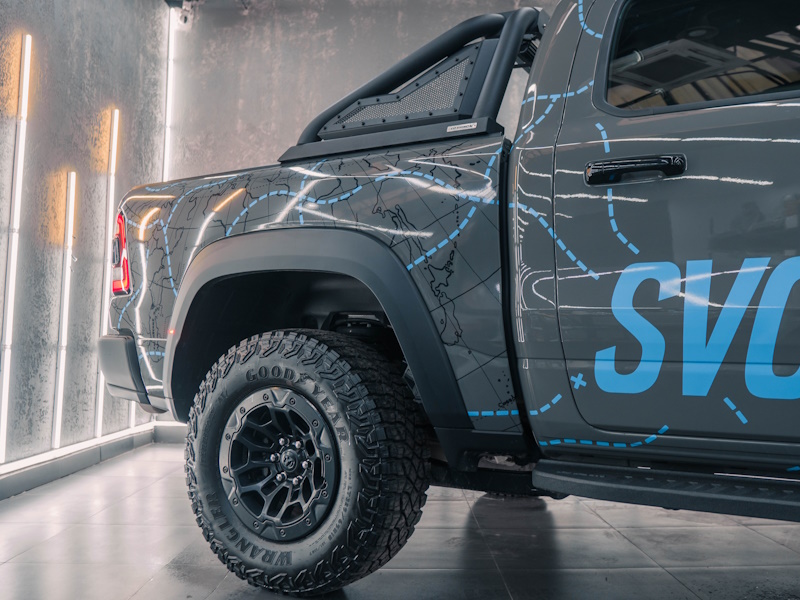 Оклеили переднюю часть кузова RAM TRX защитной полиуретановой пленкой Иристек, нанесли винилографию.