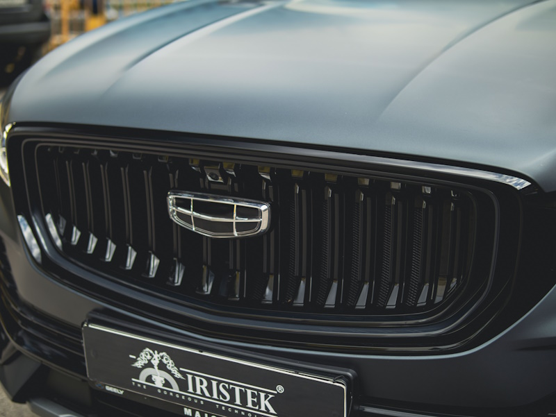 Подготовили кузов автомобиля Geely Monjaro к оклейке: удалили вмятины и отполировали. Выполнили оклейку в глянцевый полиуретан Iristek. Сделали полный антихром и оклеили передний значок в черный глянец. Покрасили диски.