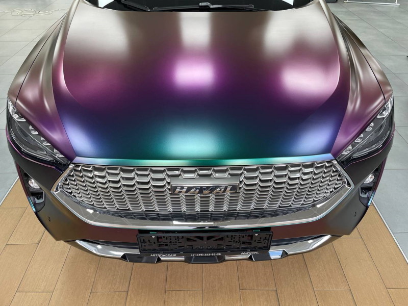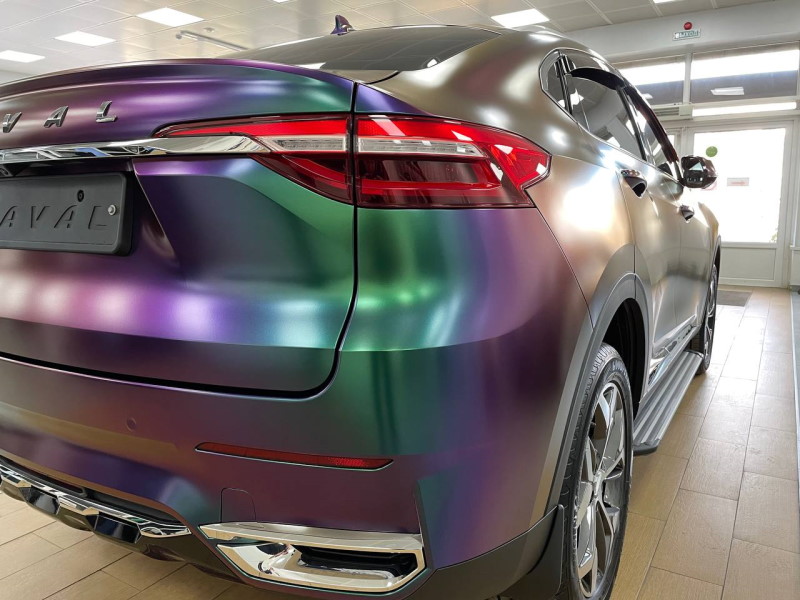 Оклеили кузов автомобиля Haval F7 в цветной автовинил хамелеон, для дополнительной защиты и блеска на пленку нанесли керамическое покрытие, сделали тонировку задней полусферы.