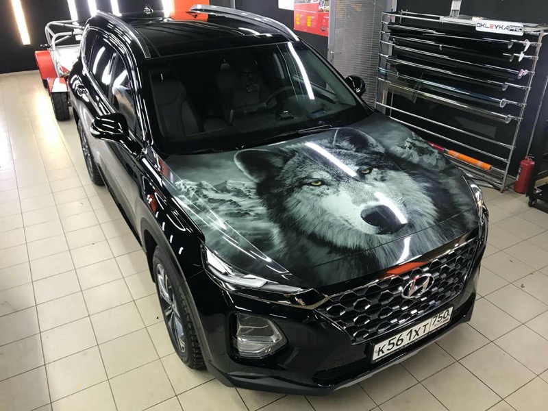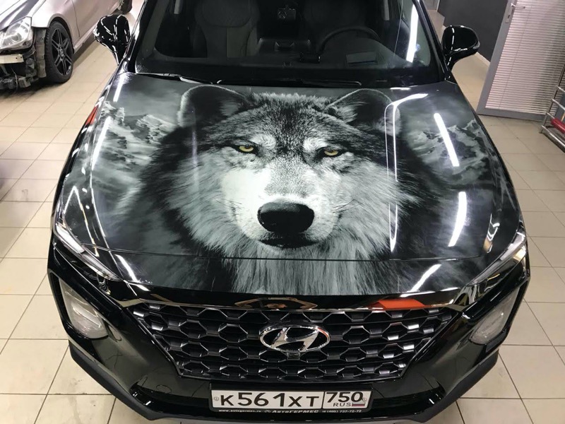 Нанести изображение волка на капот. Аэрография пленкой на машину Hyundai Santa Fe.