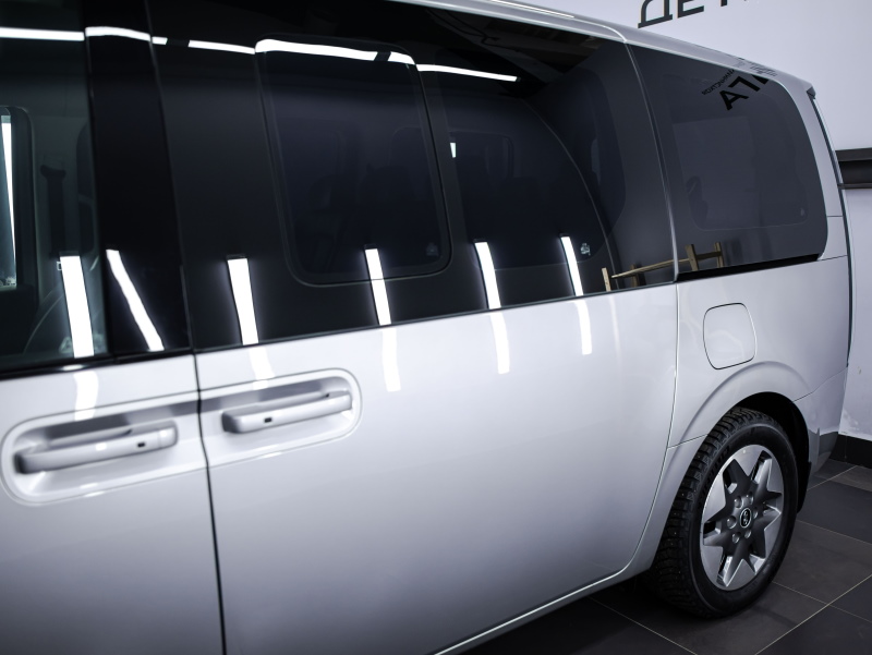 Защитили кузов автомобиля Hyundai Staria в глянцевый полиуретан, забронировали лобовое стекло. Затонировали переднюю полусферу в атермальную пленку.