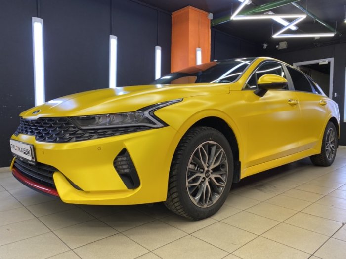 Задача: изменить внешний вид автомобиля, сделать ярким, заметным на дороге. Стайлинг автомобиля Киа К5. Желтый матовый автовинил, жидкая керамика, защита фар, антидождь.