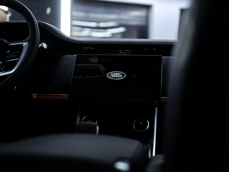 Оклеили кузов автомобиля Range Rover в прозрачный глянцевый полиуретан, на пленку нанесли керамику. Защитили экран в салоне в статическую пленку.