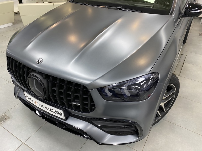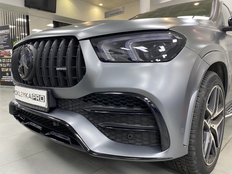 Защитить кузов автомобиля Mercedes GLE полиуретановой бронировочной пленкой. Изменить цвет с глянцевого на матовый. Для дополнительной защиты покрыть поверхность керамикой. Затонировать.
