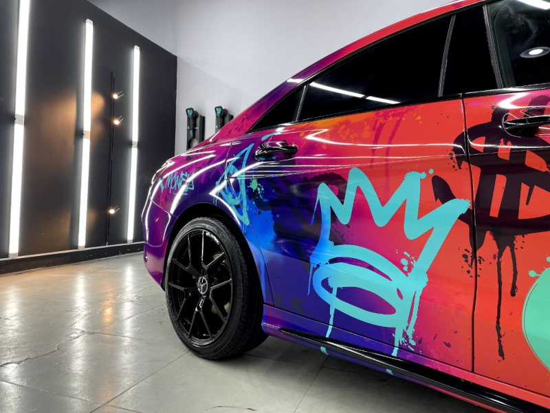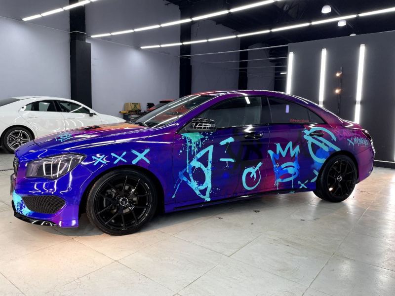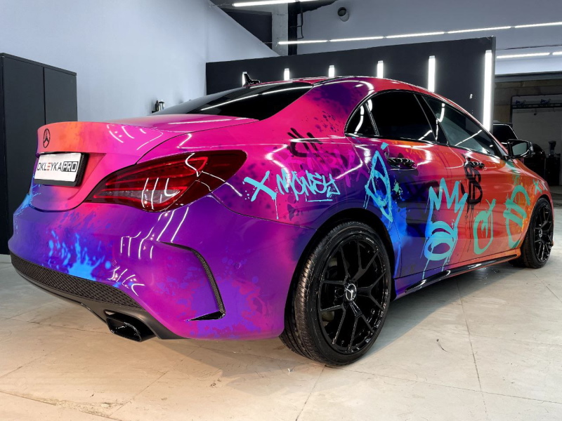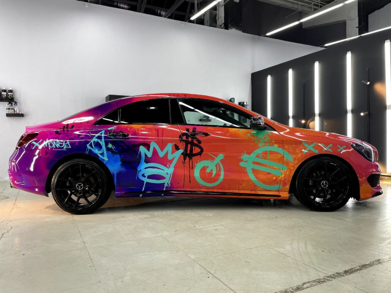 Создание оригинального образа автомобиля Mercedes-Benz CLA: разработка дизайн-макета и оклейка винилографии (абстракция с граффити).