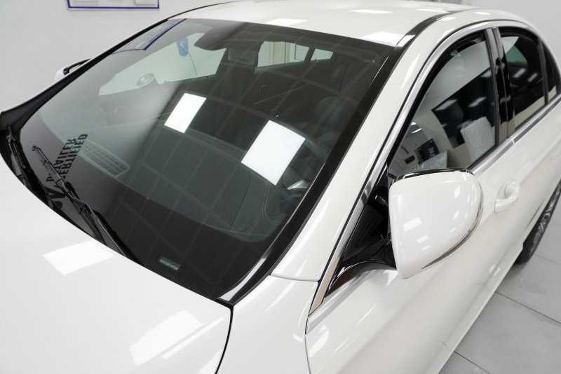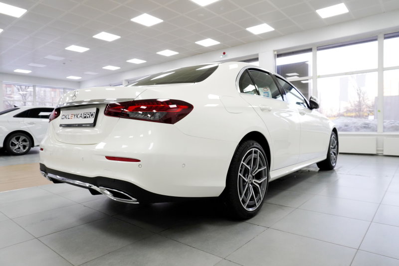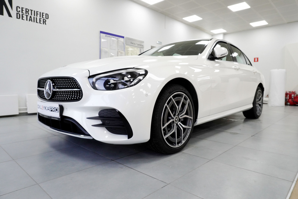 Оклеили кузов автомобиля Mercedes E-Class в защитную глянцевую полиуретановую пленку, забронировали лобовое стекло, защитили боковые стойки.