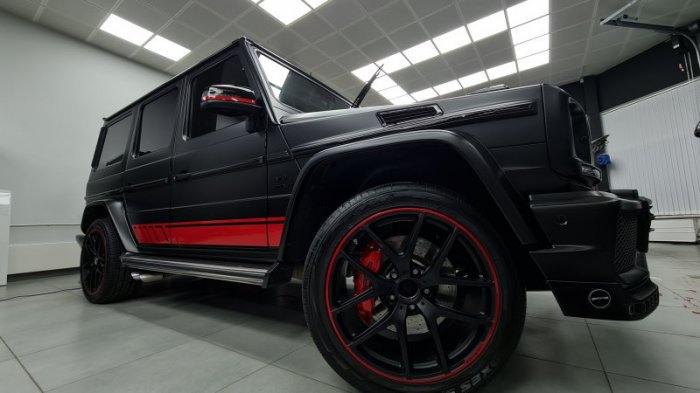 Задача: выполнить стайлинг автомобиля Mercedes-Benz G-класс: изменить цвет, нанести красные спортивные полосы, покрасить диски, сделать антихром, затонировать в круг.