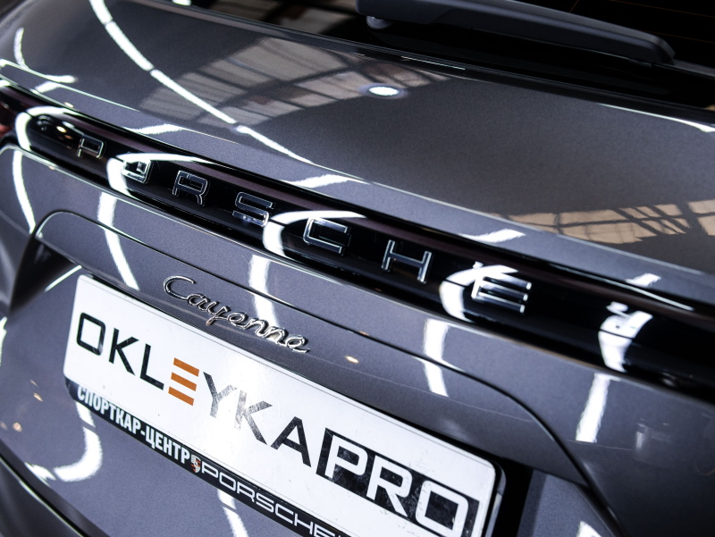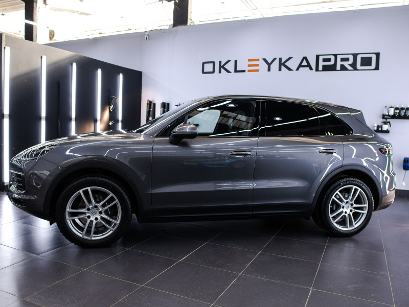 Оклеили зоны риска автомобиля Porsche Cayenne в глянцевый полиуретан, затонировали заднюю полусферу.