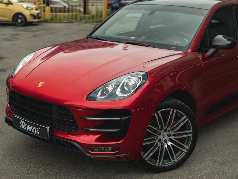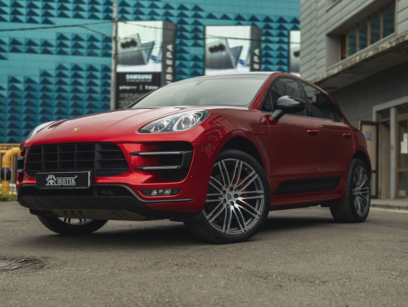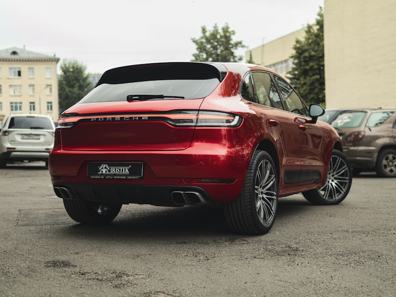 Выполнили полную оклейку кузова автомобиля Porsche Macan в цветной автовинил IRISTEK (кристально-красный).