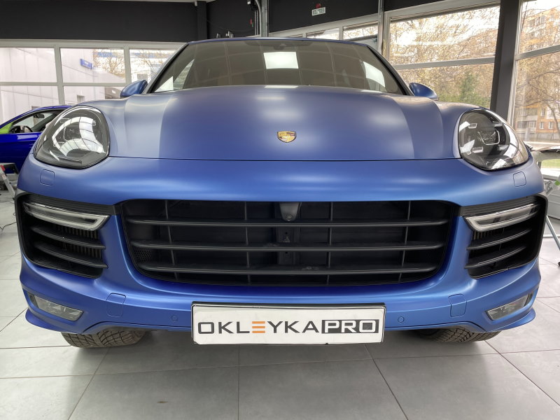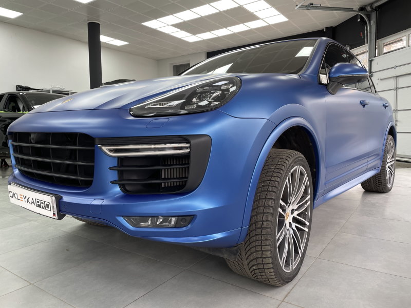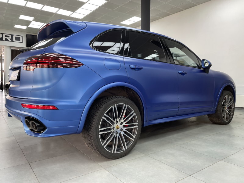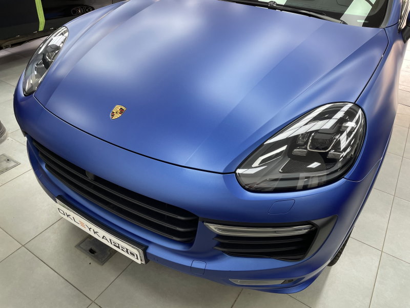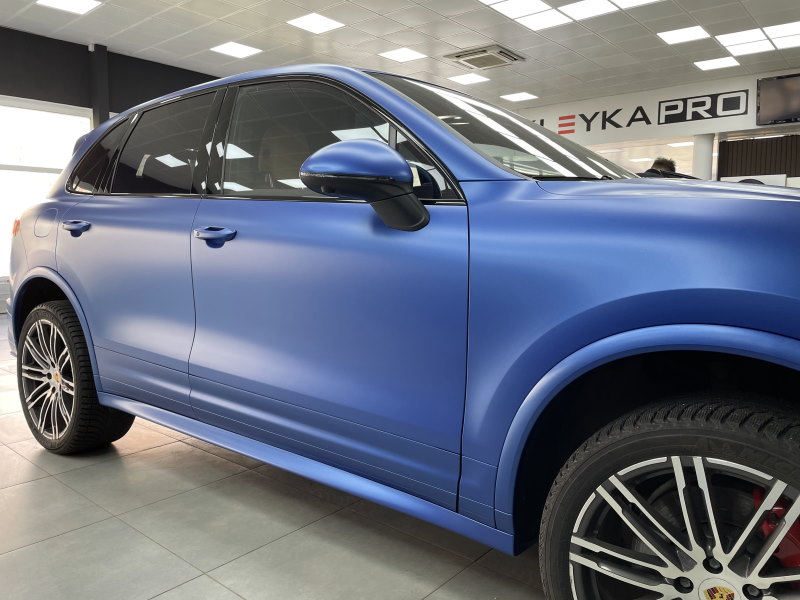 Оклейка автомобиля Porsche Cayenne в синий матовый сатин, нанесение керамики на пленку для дополнительной защиты и блеска, тонировка по кругу, антихром.