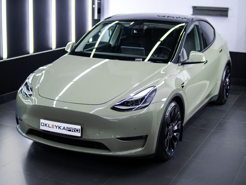 Оклеили кузов автомобиля Tesla Model Y с проемами в цветной винил и защитили его в глянцевый полиуретан. Сделали антихром оконных молдингов.