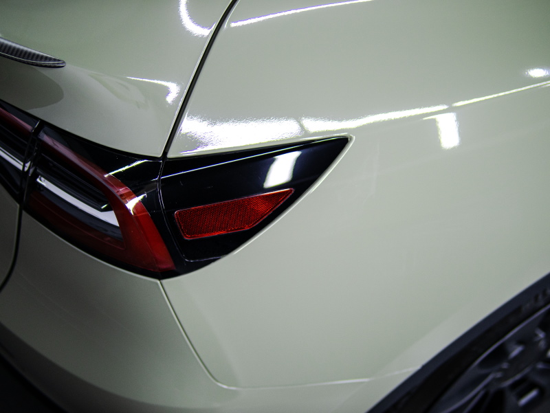 Выполнили оклейку крыши, плавника и рейлингов в черную гибридную пленку, оклеили капот в черный полиуретан. Защитили фары и задние фонари в притемненный полиуретан, затонировали заднюю полусферу. Отполировали оставшуюся часть кузова и покрыли защитным составом Gyeon Mohs+. Нанесли защитные составы на кожу в салоне.