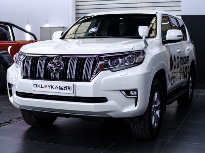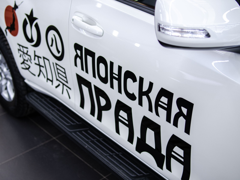 Разработали дизайн и нанесли винилографию на кузов автомобиля Toyota Land Cruiser Prado, затем полностью оклеили его в глянцевый полиуретан.