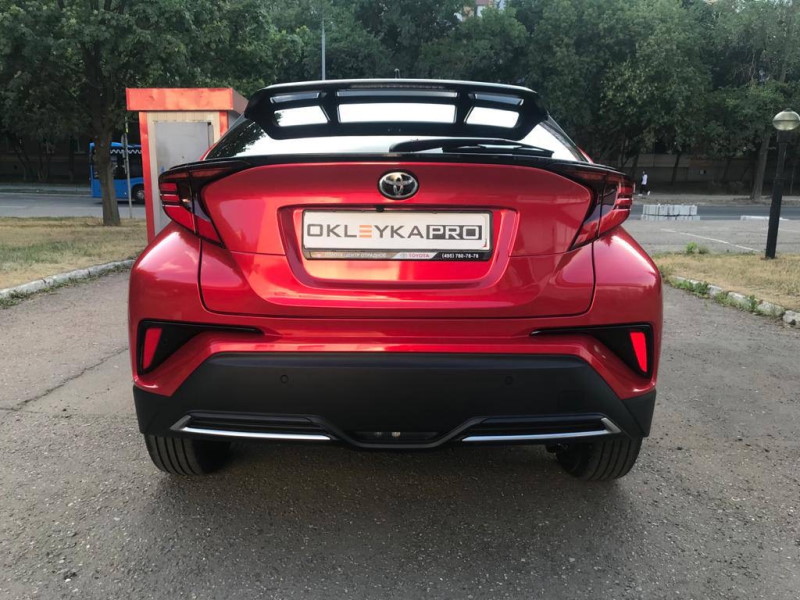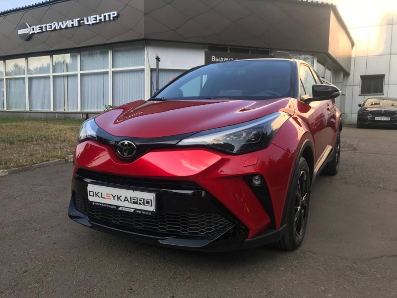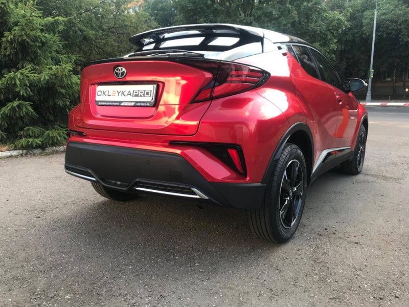 Оклеили кузов автомобиля Toyota C-HR в красную виниловую пленку TeckWrap, для дополнительного блеска и защиты на пленку нанесли керамическое покрытие, выполнили тонировку в круг, сделали детейлинг дисков и резины.