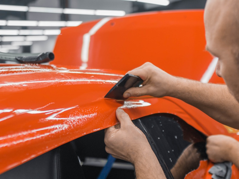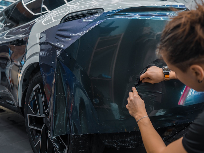 Разметка и нарезка пленки. Пленка нарезается по размеру и форме каждой панели кузова. Это делается с учетом особенностей автомобиля, чтобы избежать излишков и обеспечить точное покрытие.Нанесение пленки. Пленка аккуратно накладывается на поверхность панели, начиная с одного края и постепенно разглаживая её по всей площади. Используются специальные инструменты, такие как резиновые ракели, для удаления пузырьков воздуха и складок. При необходимости пленку можно нагреть с помощью фена для придания ей большей эластичности и улучшения адгезии.