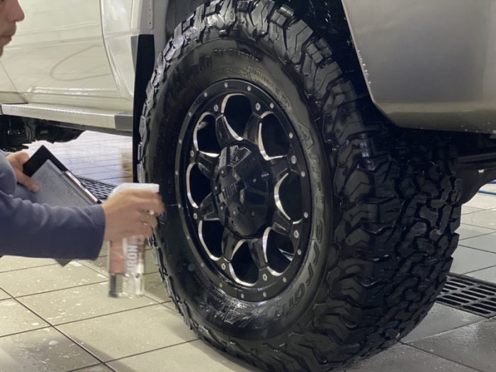 Очищаем и полируем шины. Схема аналогична мойке дисков. Очиститель используем универсальный, предназначенный также для пластика и заменителя кожи в салоне. Завершаем обработкой покрышек гидрофобной полиролью для глубокой очистки пор резины и придания ей глубокого черного цвета.