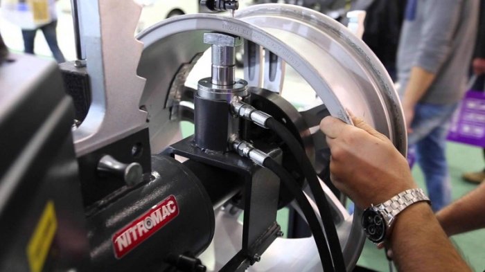 Литые диски (из высокопрочного сплава алюминия). Они легче и жестче стальных дисков, поэтому от удара чаще трескаются и образуют сколы, чем гнутся. Восстанавливаем их при помощи гидравлического станка для правки. Диск устанавливаем на стапель и выпрямляем в месте деформации при помощи пресса с ручным управлением.