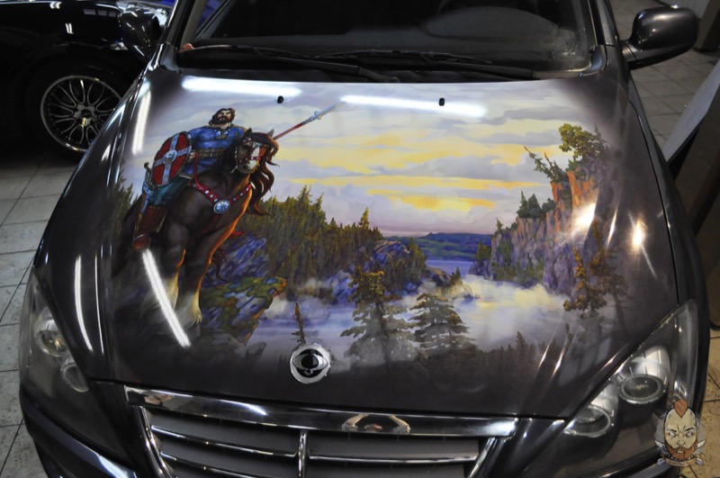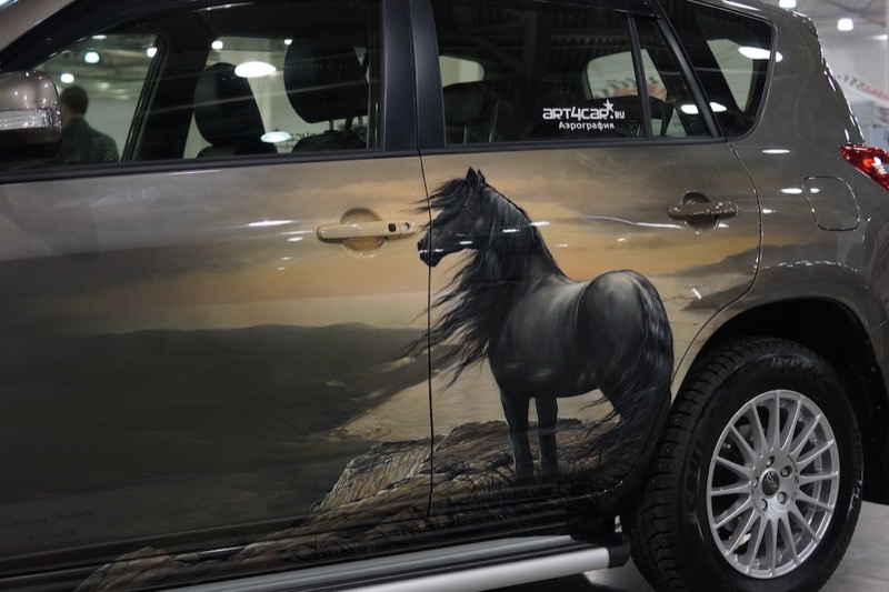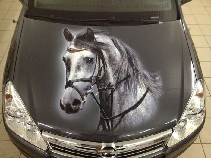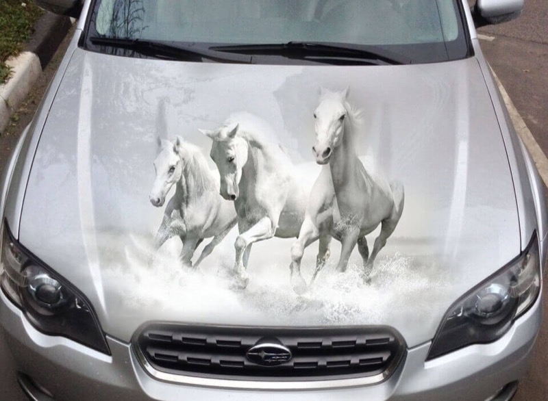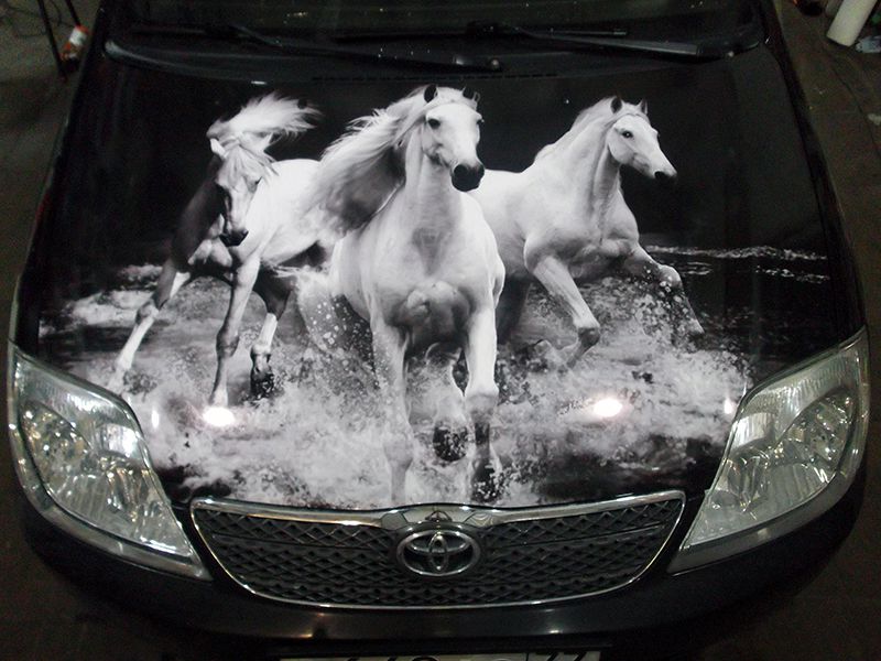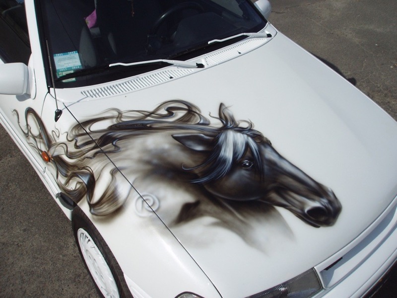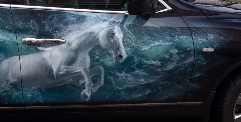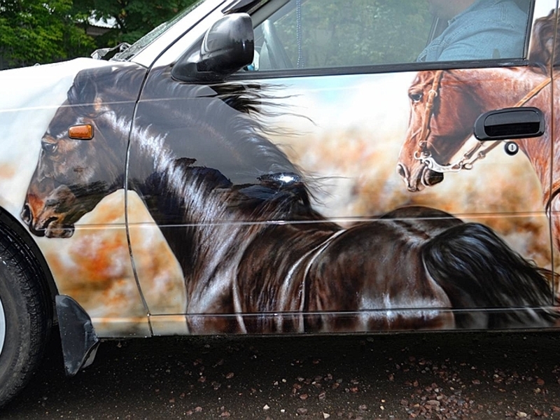 Аэрография на авто с изображением одной или группы лошадей. Рисунок коня на капот, двери, крышу или весь кузов.