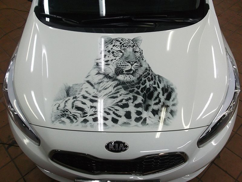 Винилография на авто с изображением леопарда: на капот, двери, багажник и весь кузов.