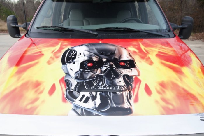 Закажите изготовление виниловой наклейки на авто со своим любимым рисунком или кадром любого фильма о Терминаторе.