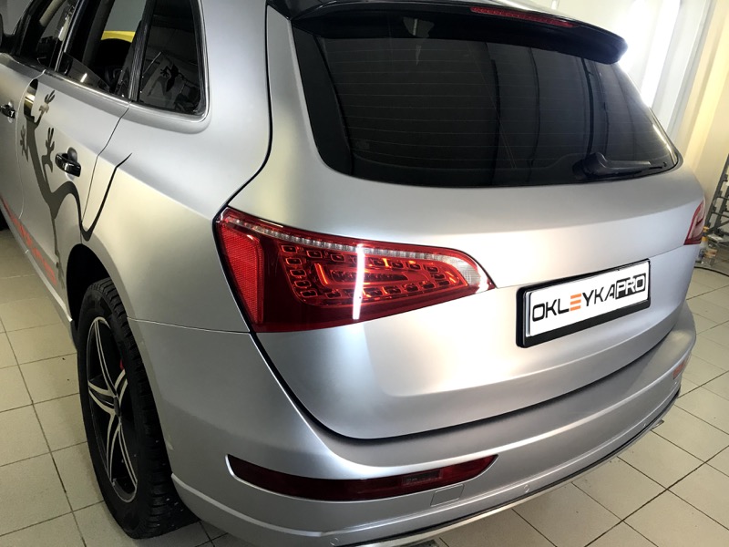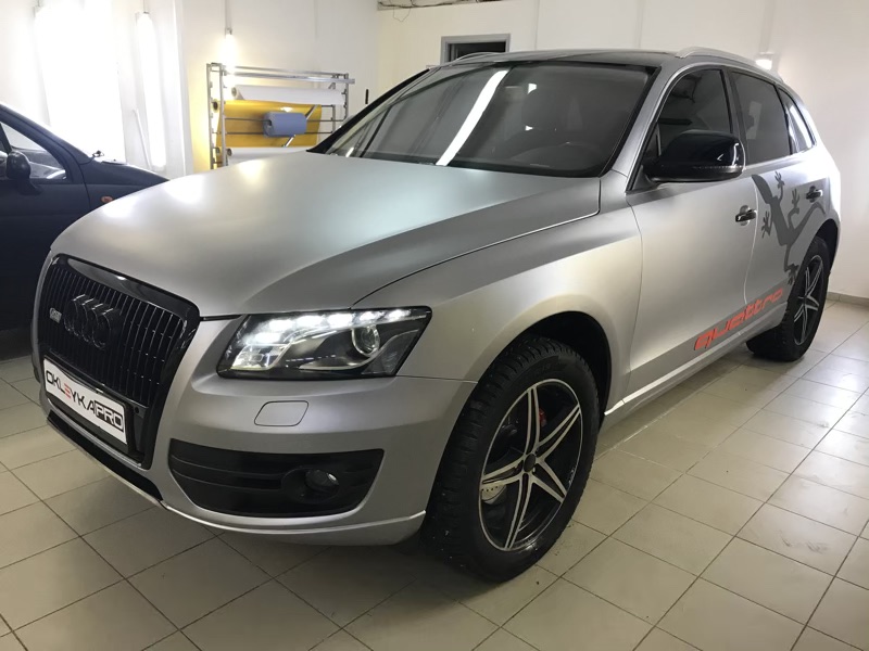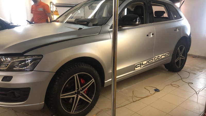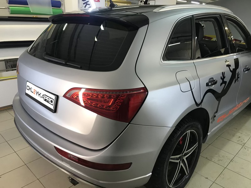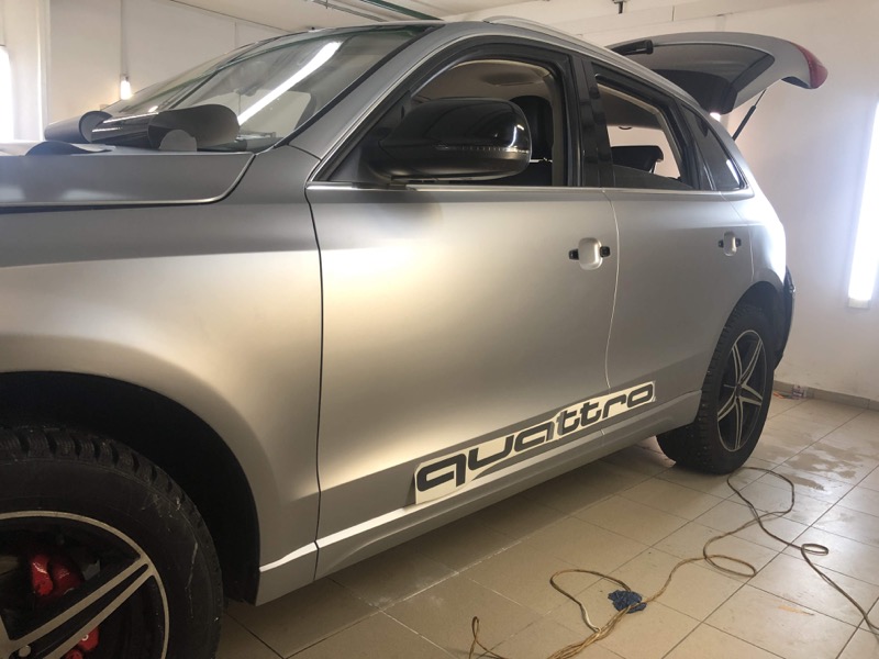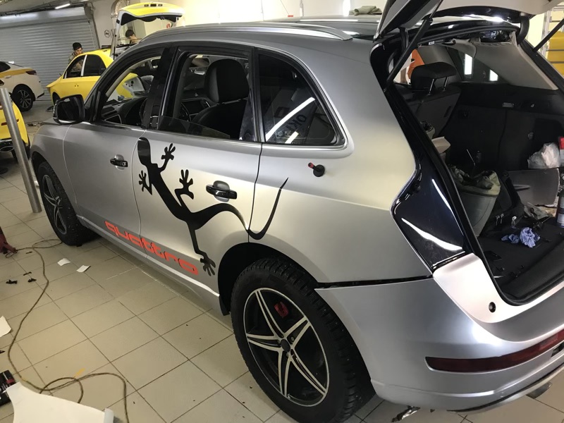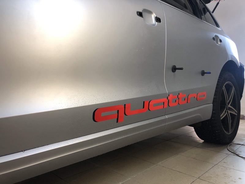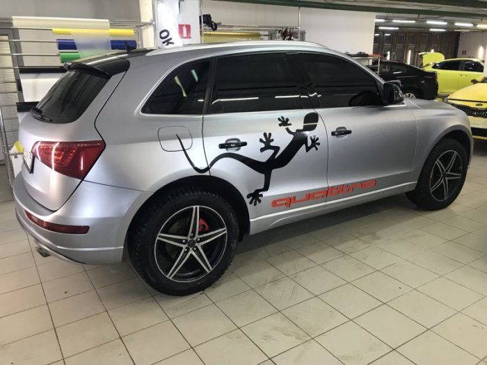Что входит в услугу: полная оклейка автомобиля пленкой TeckWrap, нанесение виниловых рисунков на боковые стороны автомобиля: слова «Quattro» и ящерицы.