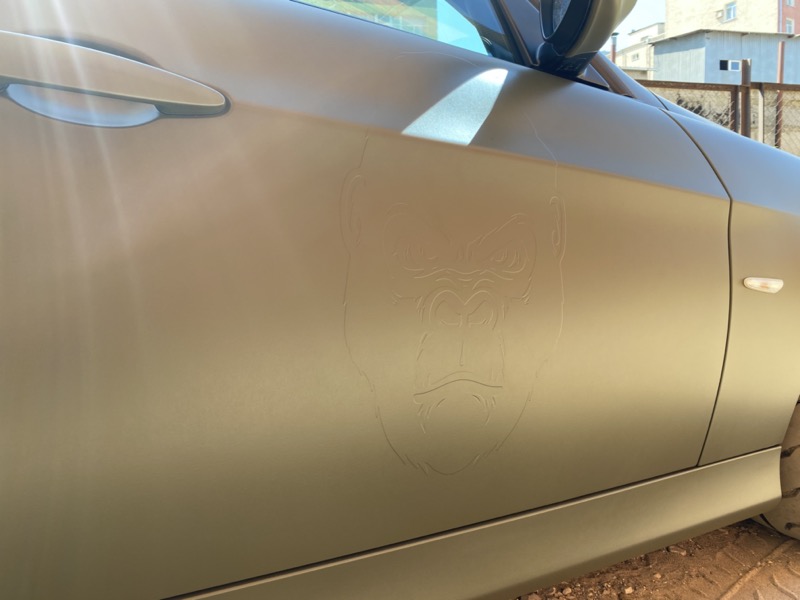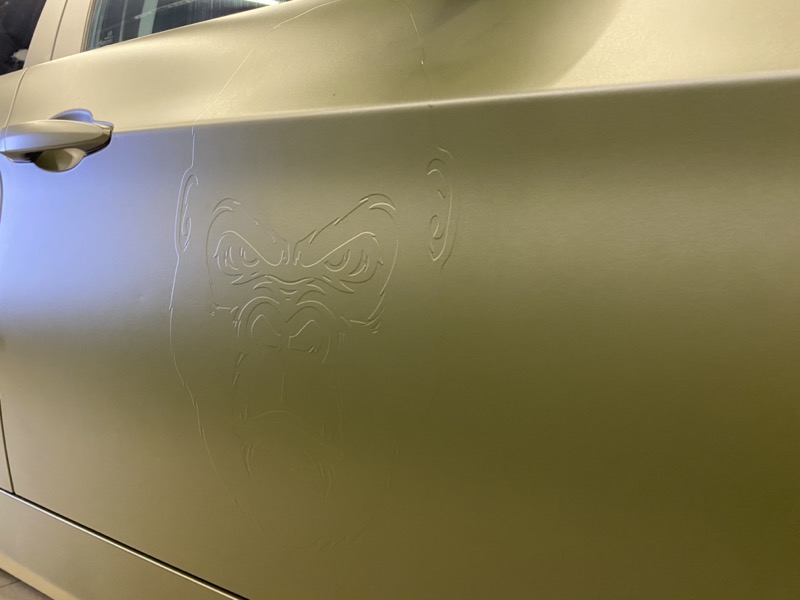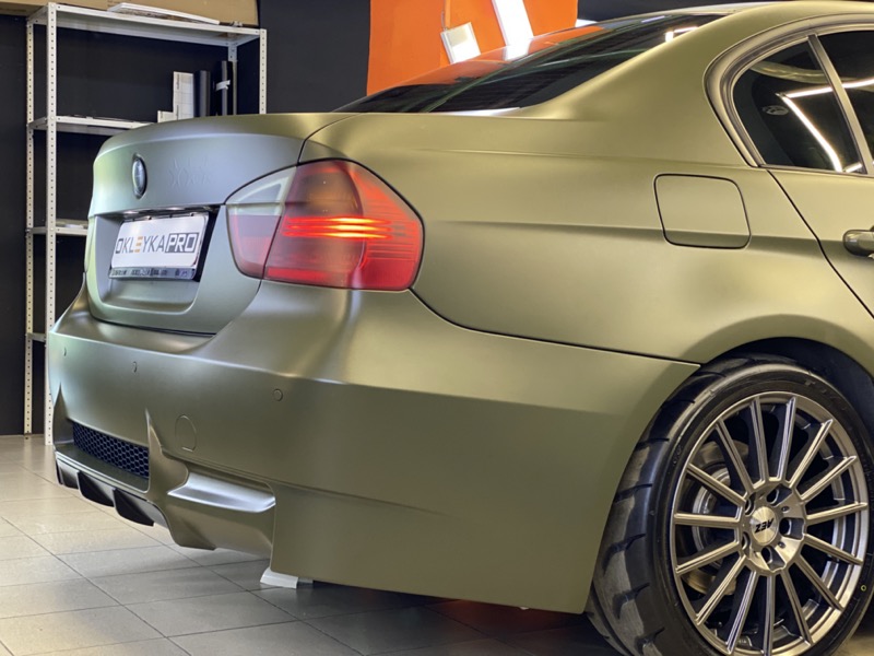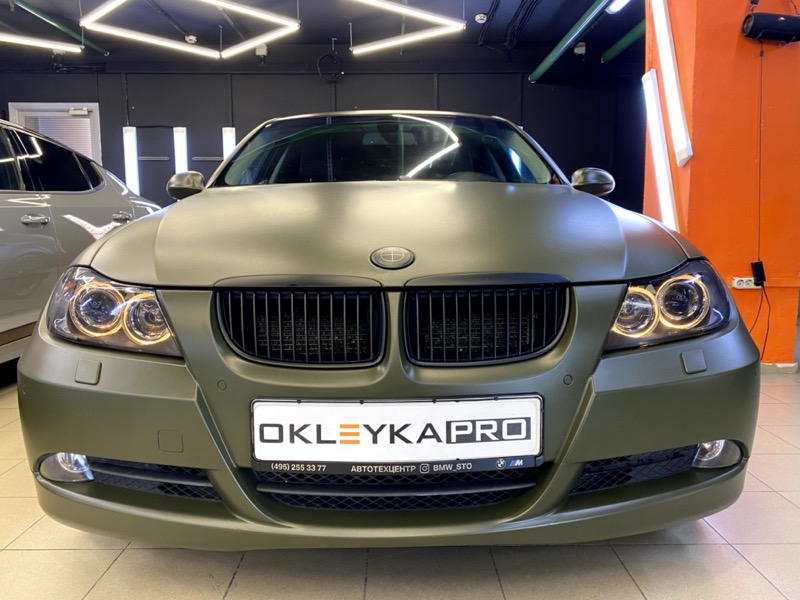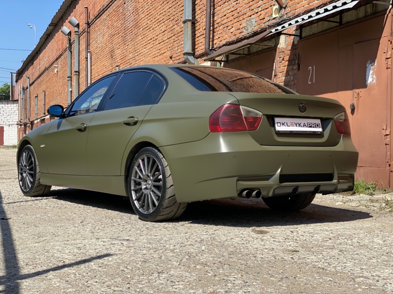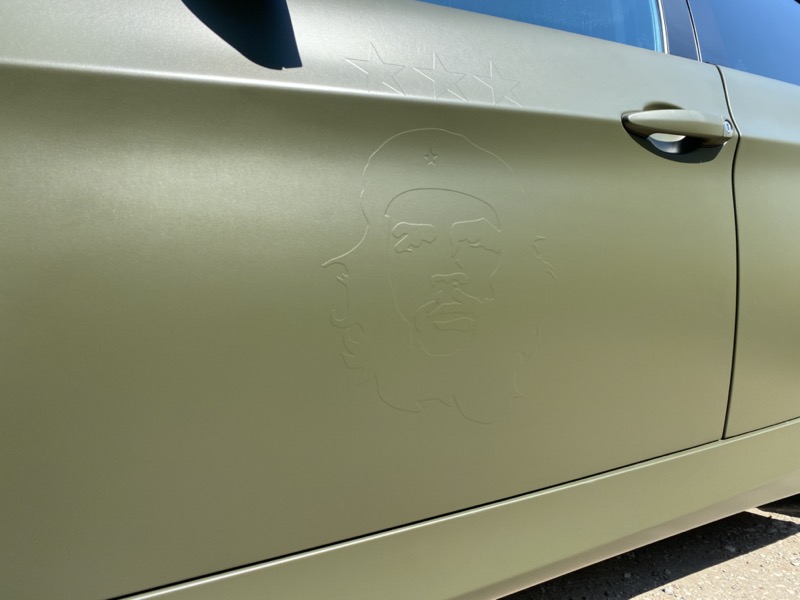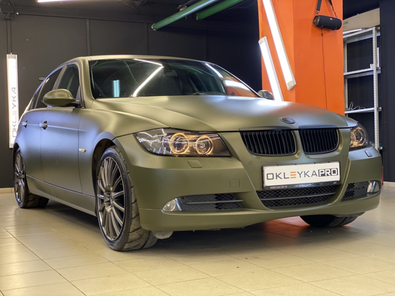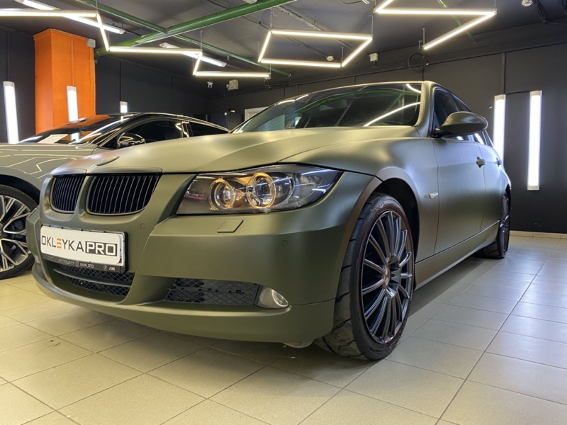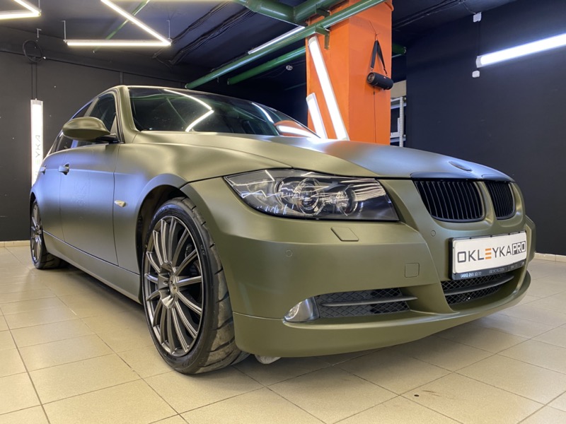Полная оклейка в виниловую матовую пленку цвета «Хаки» с рельефом на дверях в индивидуальном стиле