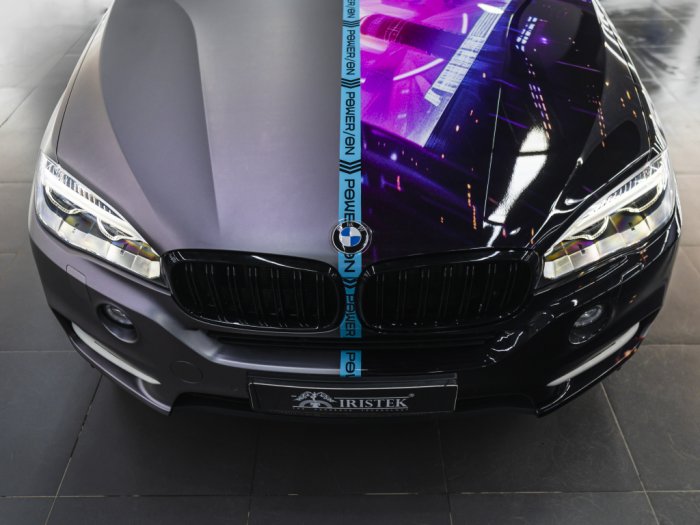 Оклеили правую часть автомобиля цветной виниловой пленкой IRISTEK, на левую часть нанесли винилографию.