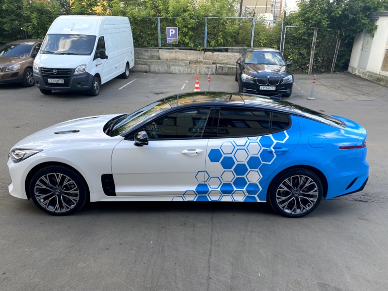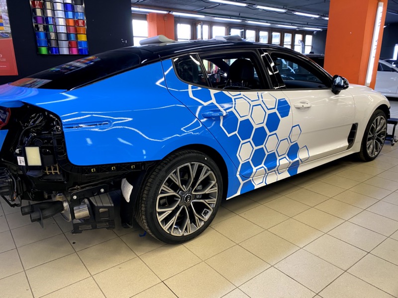 Полная оклейка в виниловую пленку: 2 цвета бело-голубой с аппликацией «Соты»