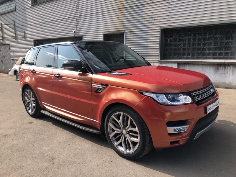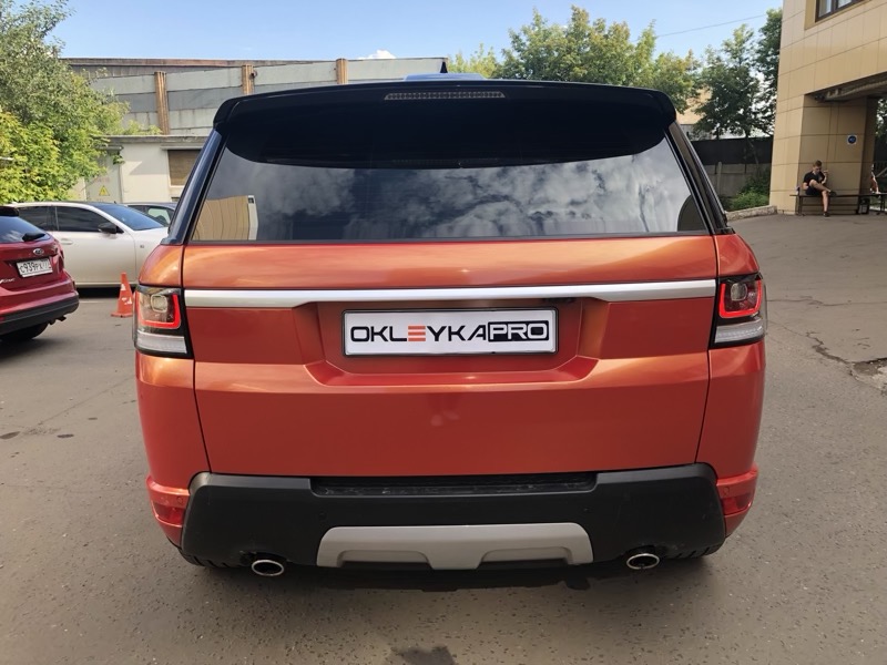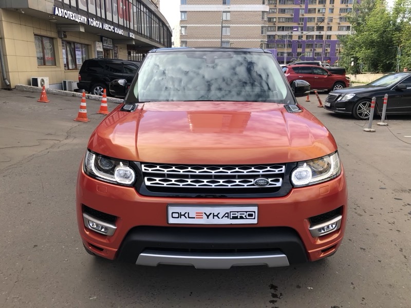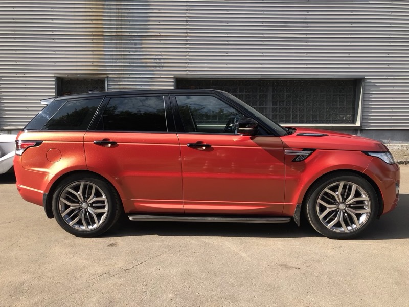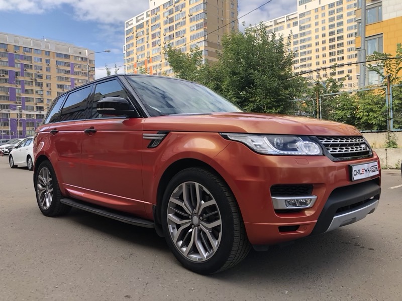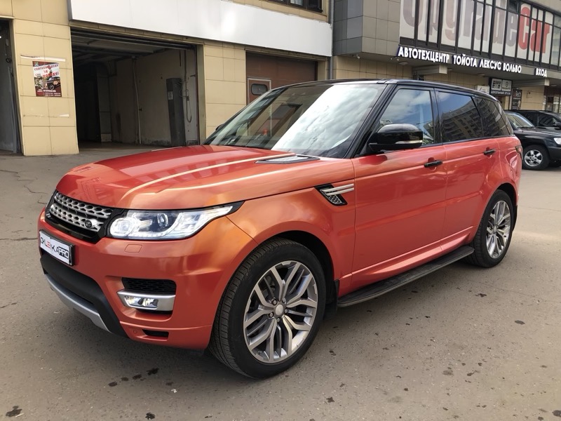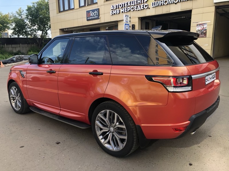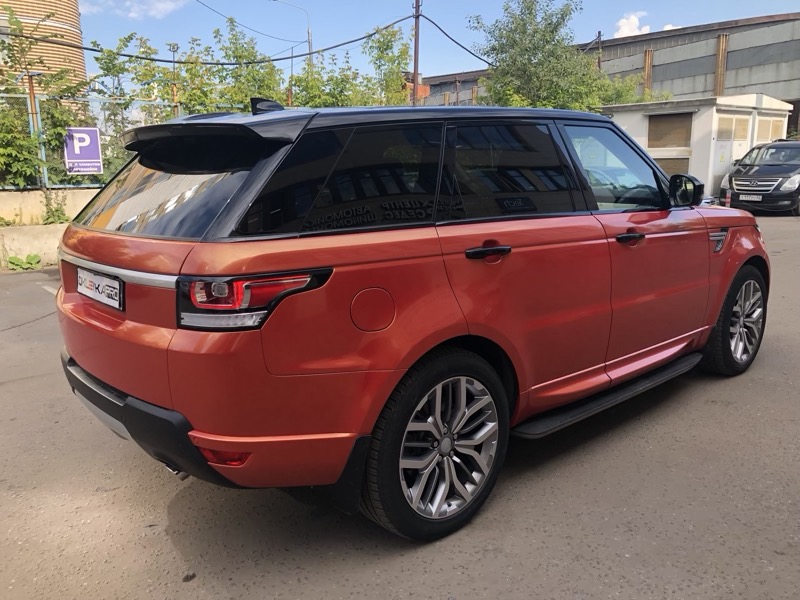 Задача: оклеить автомобиль в два цвета: черный верх и оранжевый низ. Красивый стайлинг автомобиля Ренж Ровер. Позволяет выделиться из потока и снижает риск угона, т. к. машине не затеряться во дворах.